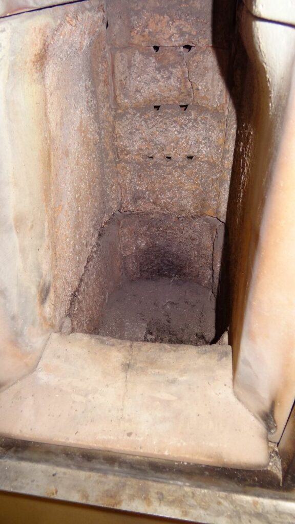 Um die Brennkammersteine auszutauschen muss man nur die Tür aushängen. Dann kann man Stück für Stück alle Steine herausnehmen (Bis auf den Dachstein der Wirbelkammer. Der ist sehr massiv und wird in der Regel nie ersetzt werden müssen).