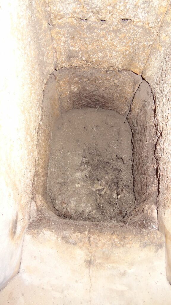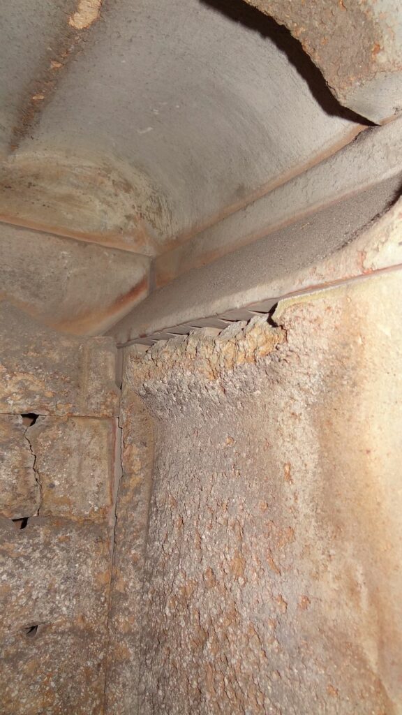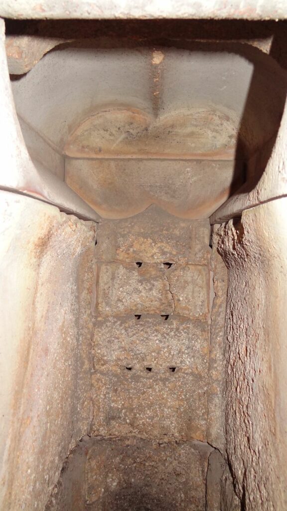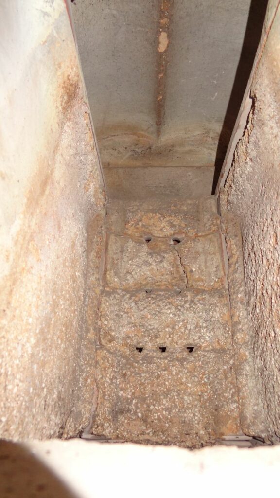 Hier ein Blick direkt in die Doppel-Wirbel-Kammer. Man sieht hier, daß alle Steine der Wirbelkammer komplett intakt sind, jedoch die unteren Wandsteine leichte Abnutzungen haben: