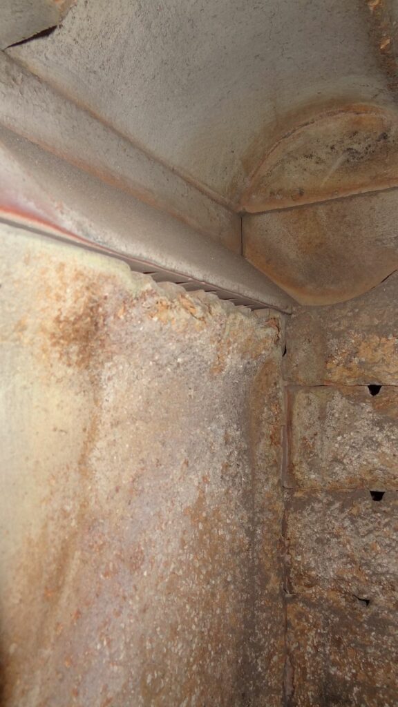 Dann ein Blick nach oben. Man sieht hier kleine Fehlstellen an dem Wandstein oben rechts. Ein Stein der Rückwand hat einen Riss: