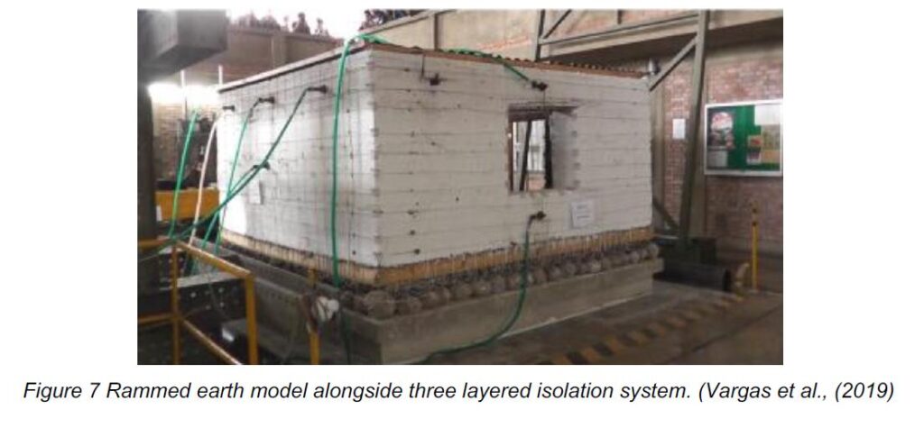 Und hier noch ein Bild aus der Studie; ein Gebäude aus Stampflehm auf einem Shicra-Fundament, positioniert auf einer Rüttelplatte zur Simulation von Erdbeben: