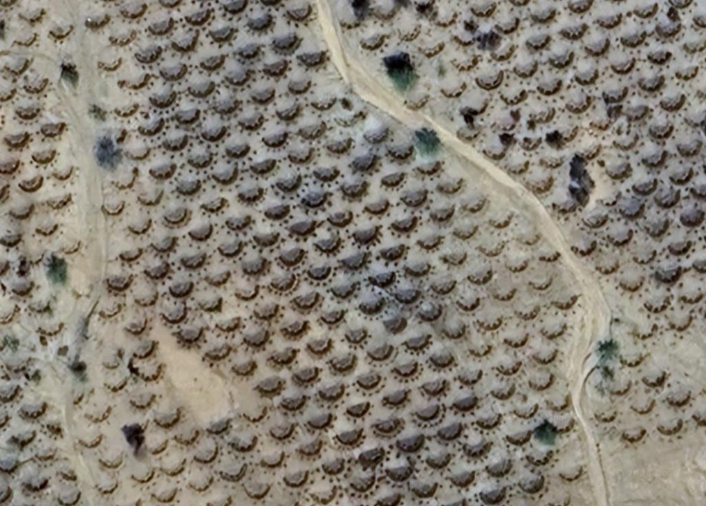 Eine der Methoden um die Wüste zu begrünen sind sogenannte „Earth Smiles“, auch „Waterbunds“ oder „Demi Lunes“ genannt. Es sind halbkreisförmige Mulden, der Aushub hangabwärts zum halbrunden Wall aufgeschichtet.