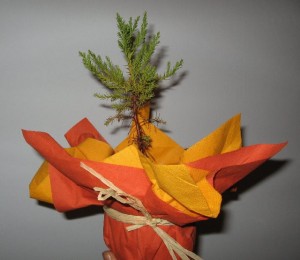 Wir bekommen einen (noch kleinen) Riesenmammutbaum geschenkt. Im Lauf der nächsten 1000 Jahre kann er eine Größe von über 100 Metern und einen Stammdurchmesser von mehr als 10 Metern (!) erreichen. Mehr Details zu dieser besonderen Baumart, die auf lateinisch Sequoiadendron giganteum heißt, ist bei Wikipedia zu finden.