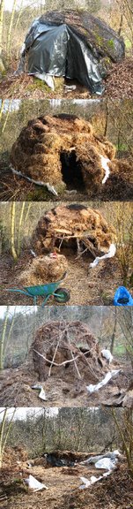 Letzte Woche, am 22./23. Febr., zerlegte ich das 14 Jahre alte Strohballen Iglu. Im Frühjahr 1993 baute ich mit mehreren Helfern dieses Strohbauwerk. Das Traggerüst sind gebündelte Äste, die Strohballen sind mit Holzstäben vernagelt und mit Plastikplanen vor Wasser geschützt.