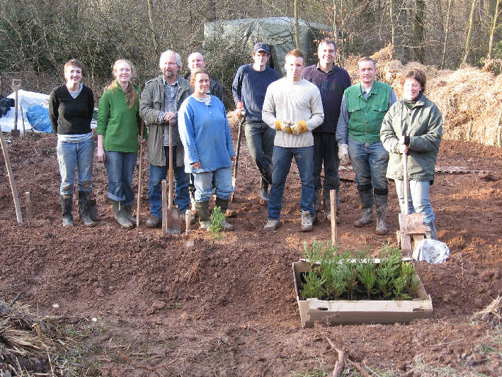 Heute haben wir mit vielen Helfern das Haus aus Mammutbäumen gepflanzt! Insgesamt wurden 90 Bäume gesetzt. Das obere Bild zeigt die Gruppe nach dem Pflanzen des ersten Sequoiadendron giganteum.