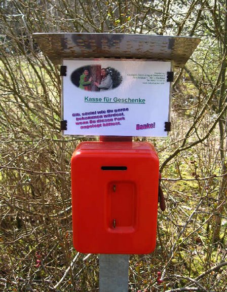Seit Jahren gibt es in unserem Naturbauten-Park eine Kasse. Dort können Besucher einen Beitrag einwerfen. In der Permakultur-Sprache nennen wir diese Box ein „money-crop-system“ (Geld-Ernte-System). Neben Münzen und Scheinen fanden wir auch schon öfters Visitenkarten oder handschriftliche Notizen. Diese Box ist multifunktional!