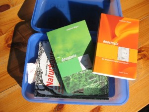 In einer Kunstoffbox stehen 3 Bücher zum Lesen zur Verfügung: