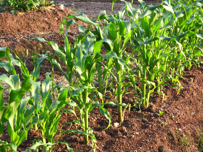 Der von uns Anfang April gesäte (gentechnik-freie) Bantam-Mais wächst sehr gut! Die Pflanzen sind schon 60 – 90 cm hoch.
