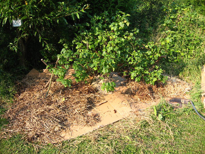 Seit wenigen Tagen fangen sind die ersten Johannisbeeren reif. Damit sie besser zu ernten sind habe ich heute mit Sense, Pappe und Stroh unter den Fruchtästen gemulcht.