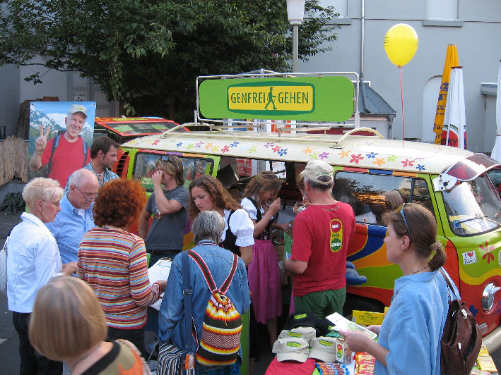 Die Wandertruppe für Gentechnikfreies Leben(Start 28.7. in Lübeck) ist gestern in Göttingen angekommen. Dort gab es eine grosse Infoveranstaltung. Der Film „Leben ausser Kontrolle“ wurde gezeigt, anschliessend gab es eine Podiumsdiskussion. In der Fussgängerzone war ein Infostand mit einem der Begleitfahrzeuge: