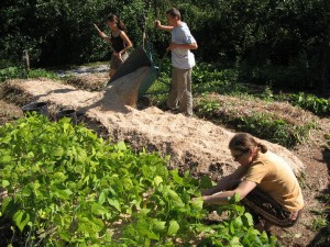 Ein Nachbar von uns produziert im grösseren Stil Brennholz. Dabei fällt viel Sägemehl ab. Dies haben wir geholt und begonnen unsere Beete damit zu mulchen.