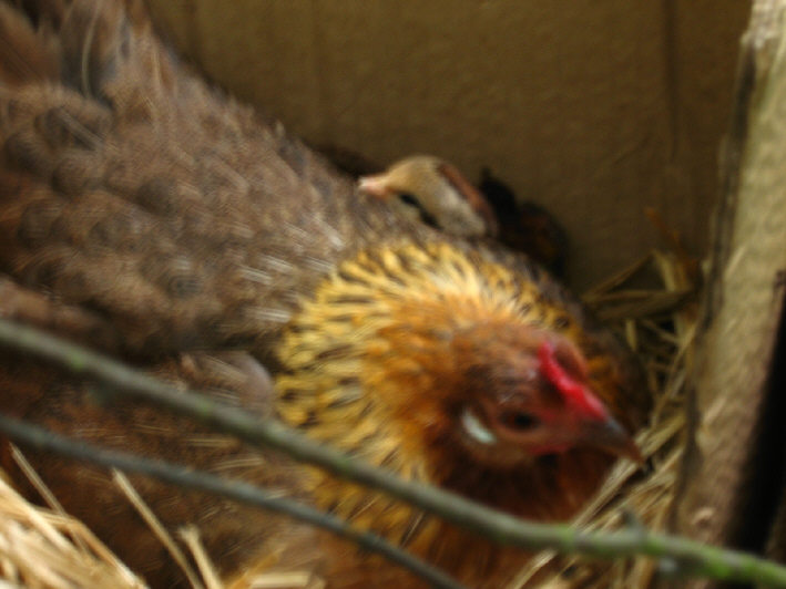 Freude und Leiden liegen manchmal nah beieinander. Eins der Küken war plötzlich aus dem Nest gefallen und quickte ganz erbärmlich. Zurück kam es nicht weil vorhandenes Stroh den Weg versperrte. Ganz vorsichtig habe ich es angehoben und zurück zur Mutter gelegt. Ich hoffe, dass es sich von dem Schrecken erholt und morgen wieder ganz munter ist.