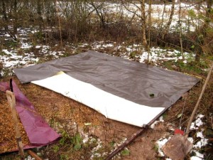 Nach reiflicher Überlegung entschied ich mich unter den Meiler eine LKW Plane zu legen. Dies hatte ich bei früheren Meilern schon gemacht, doch die Idee vom November war ob es Sinn machen könnte ohne Folie (Auf Plastik verzichten wenn irgend möglich).