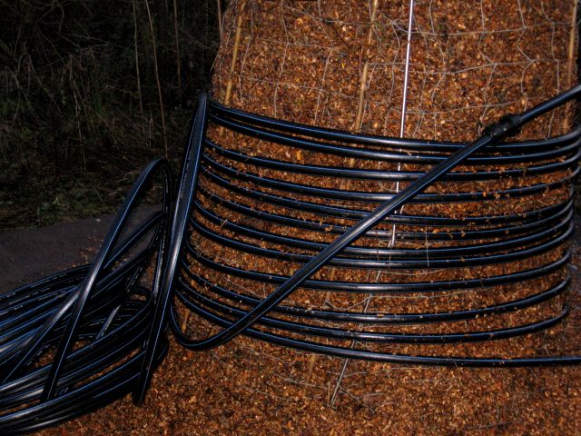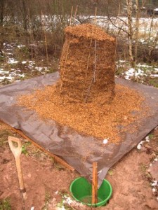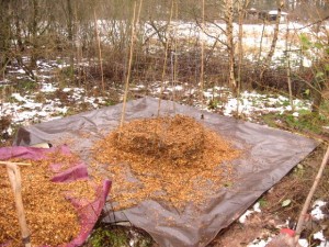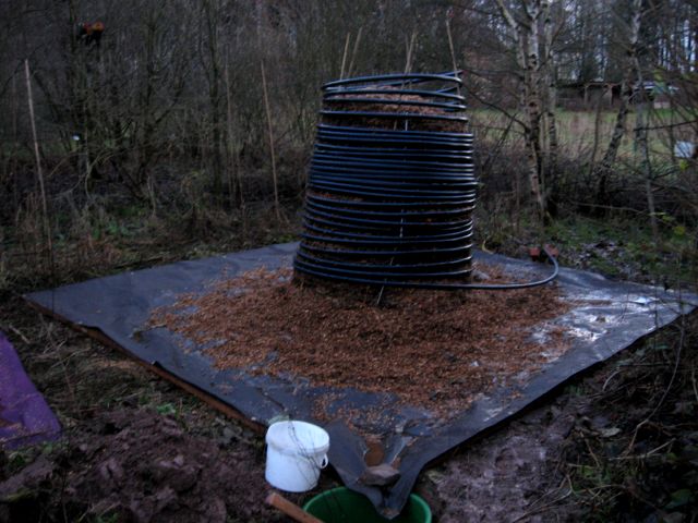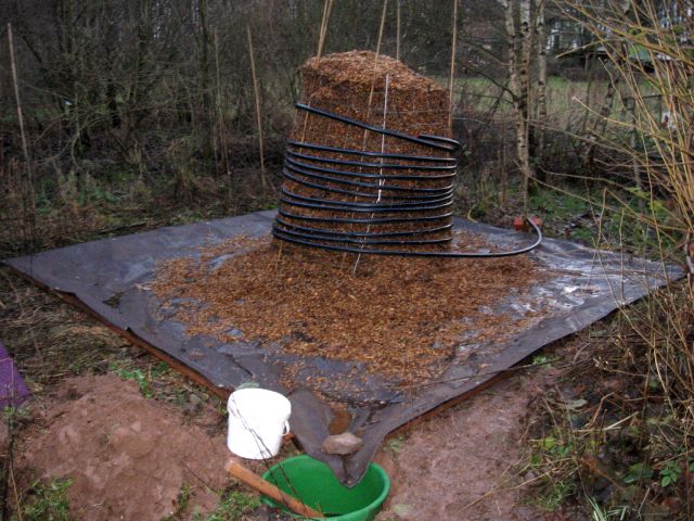 Als nächstes wird aussen rum weiteres Häckselgut geschüttet so dass die Rohre im Zentrum des Meilers schön warm werden.