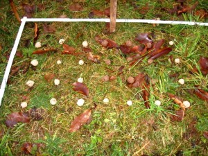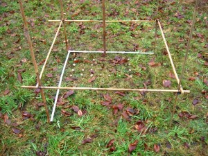Auf diesen Quadratmeter lege ich alle 10 cm eine Lehmkugel mit Samen (Seed-ball):