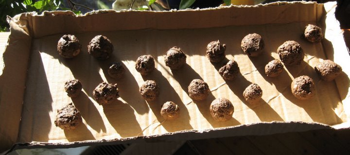 Am 7. Januar schieb ich über Masanobu Fukuoka. Heute habe ich testhalber ein paar seed-balls gemacht: Saatgutmischung plus Erde von einem Maulwurfhaufen.