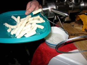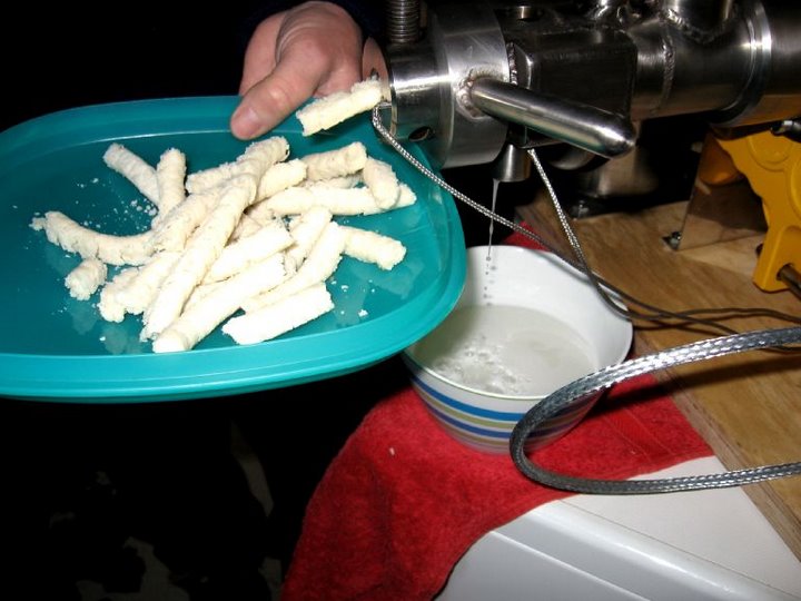 Das Bild zeigt die Herstellung von Kokosöl. Die weissen „Würste“ sind der trockene und fast ölfreie Presskuchen. Gemahlen wird dieser Presskuchen als Kokosmehl weiter verwendet. Deutlich sichtbar läuft das Kokosöl in die Schale: