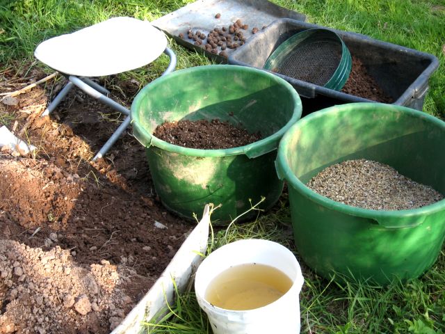 Hinten rechts: Wanne mit Erdsieb zum Aussortieren der groben Erdteile