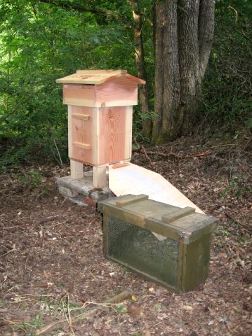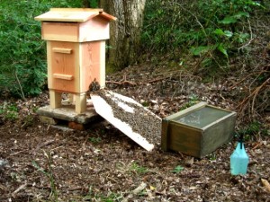 Die Bienen in der Transportkiste, im Hintergrund die Warré-Beute mit Einlaufbrett: