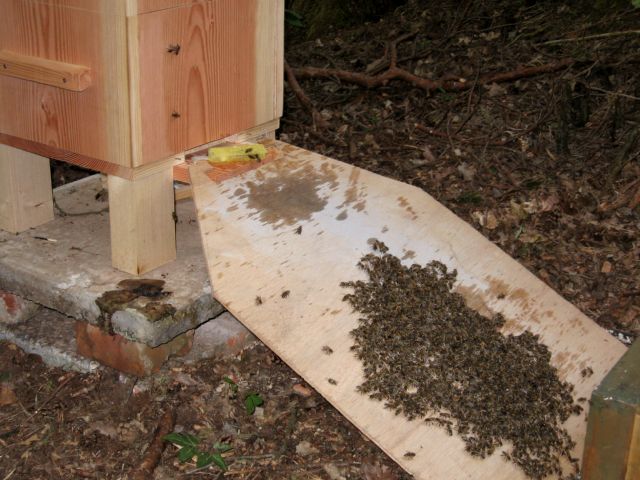 Noch ist die Königin in einem Käfig gefangen. Dieser liegt am Eingangg der Beute. Eine kleine Menge an Bienen wurde auf das Einlaufbrett geschüttet. Gleich wird die Königin freigelassen. Dann läuft sie in die Beute und die Bienen folgen: