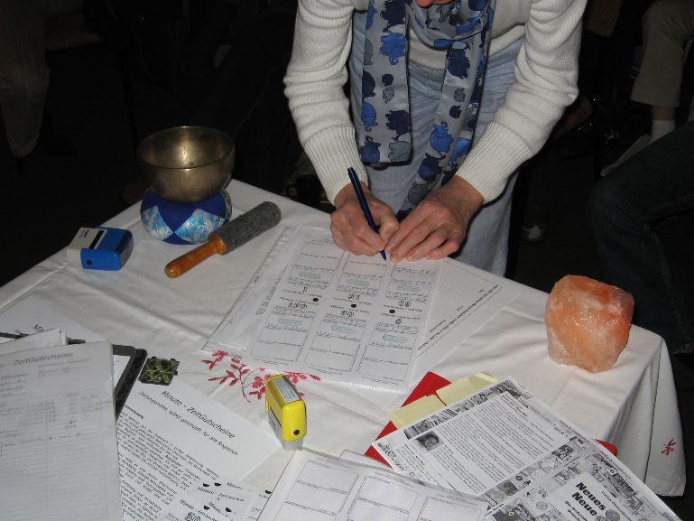 Die Lösung des Problems ist einfach: Einführung und Verwendung eines dezentral geschöpften Zahlungsmittels. Jeder einzelne Schein ist durch einen Herausgeber sowie zwei Bürgen gedeckt. Jeder Mensch kann im Rahmen seiner persönlichen Kreditwürdigkeit eigene Zahlungsmittel herstellen. Als Rechenwert werden Minuten qualitativer Leistung verwendet. Die selbst gedruckten Scheine werden durch Gültigkeitsdauer, Adress-Stempel, Datum, Unterschrift zu gültigen Gutscheinen.