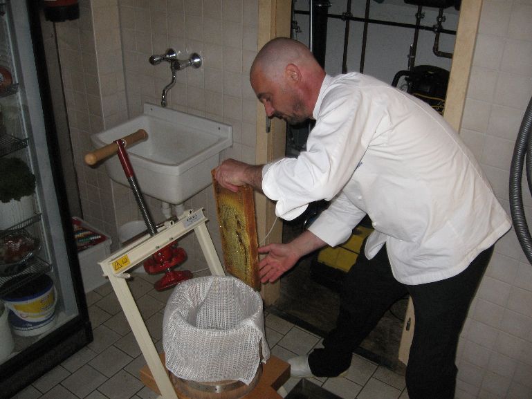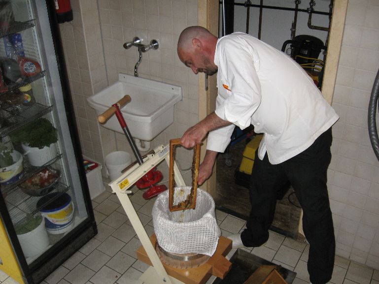 Für das Experiment wurde die OP-20 gewählt (2-größtes Modell mit 20 Liter Inhalt) mit einem groben Press-Sack. Ein befreundeter Imker stellte die Waben zur Verfügung: