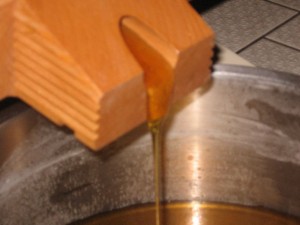 Der Pressvorgang beginnt. Für einen verbesserten Abfluß haben wir unter die Presse einen Balken gelegt, so fließt der Honig besser raus. Der Zusatzhebel für erhöhten Pressdruck ist noch nicht montiert. Trotzdem läuft der Honig gut: