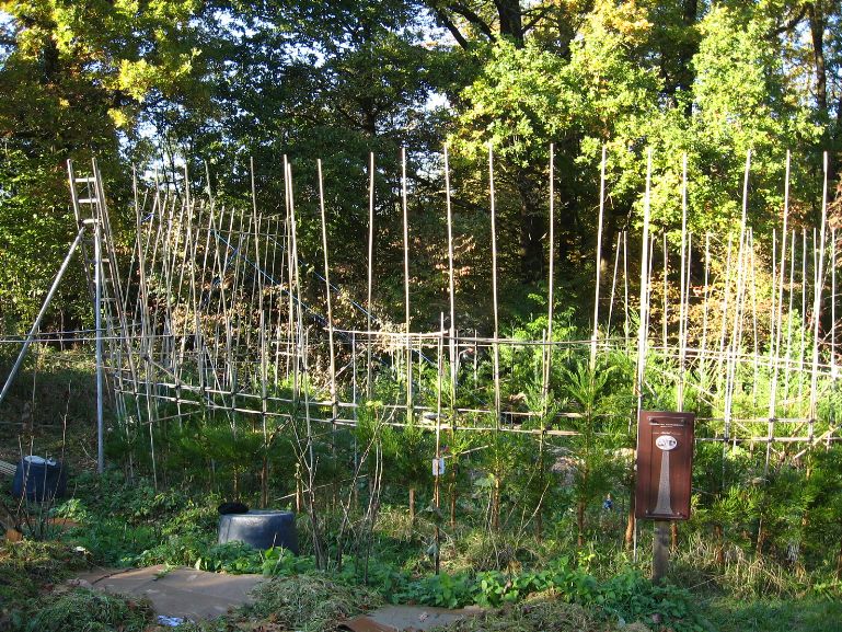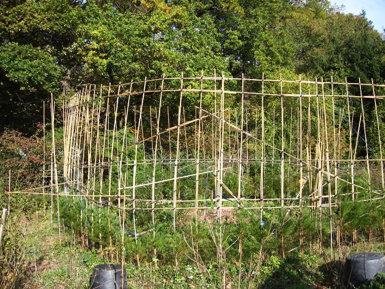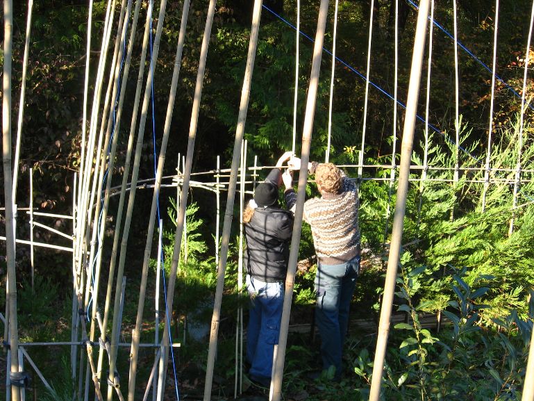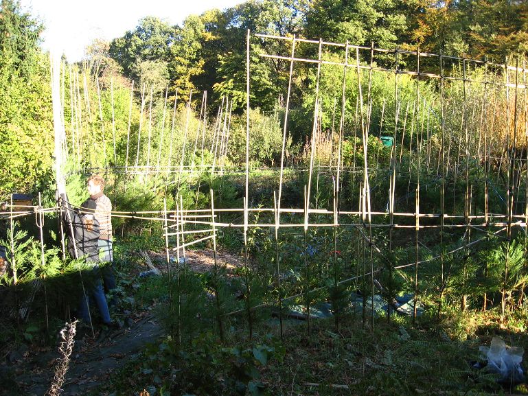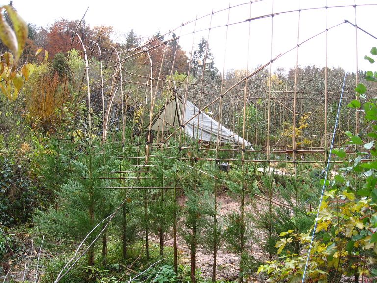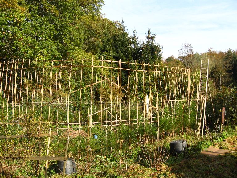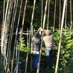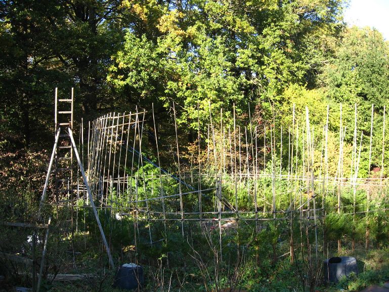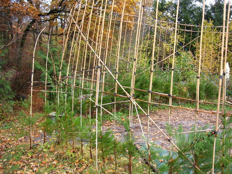 Das am 4. März 2007 gepflanzte Baumhaus aus Mammutbäumen hatte im Oktober 2007 ein erstes Gerüst aus Bambusstangen bekommen. Jetzt, 2 Jahre später, sind die ersten Mammuts schon über das alte Gerüst hinaus gewachsen (über 2m Höhe). Deshalb wurde das Gerüst jetzt nach oben erweitert. Diesmal reichten noch Leitern um das Gerüst zu bauen. Brauchen wir in zwei weiteren Jahren ein Gerüst um das Gerüst zu bauen? Wir werden sehen. Jetzt ist erst mal Zeit Bilder vom aktuellen Stand des Projektes zu genießen: