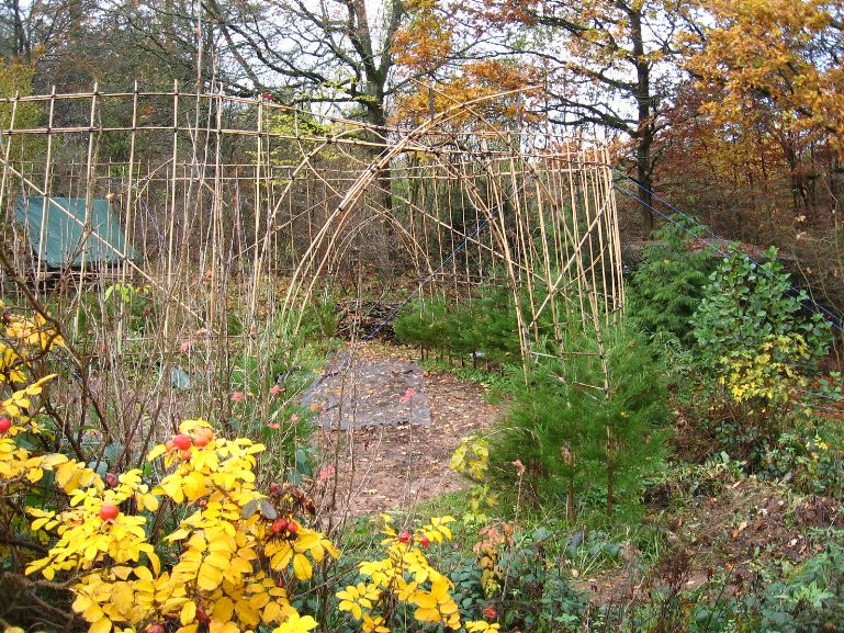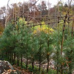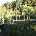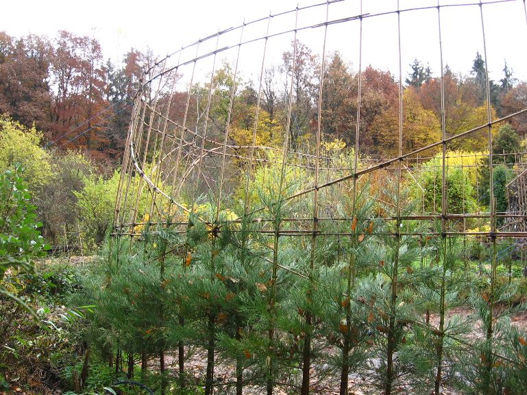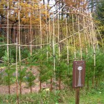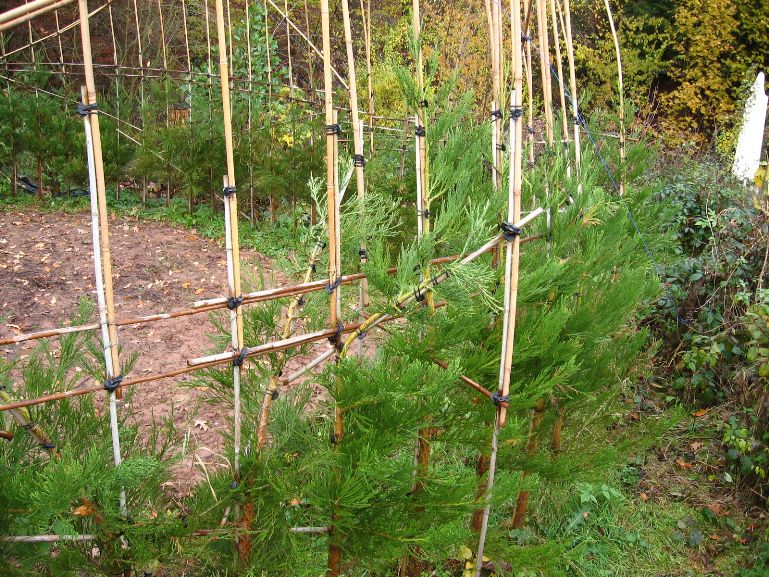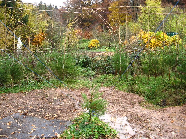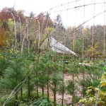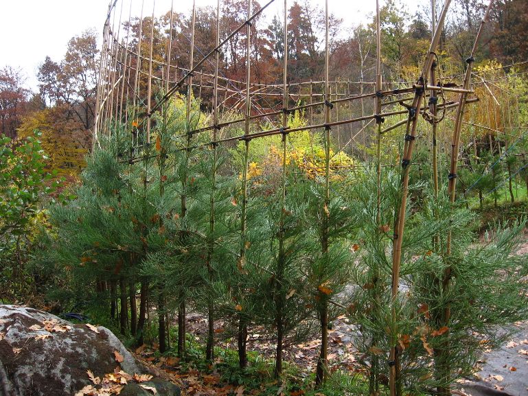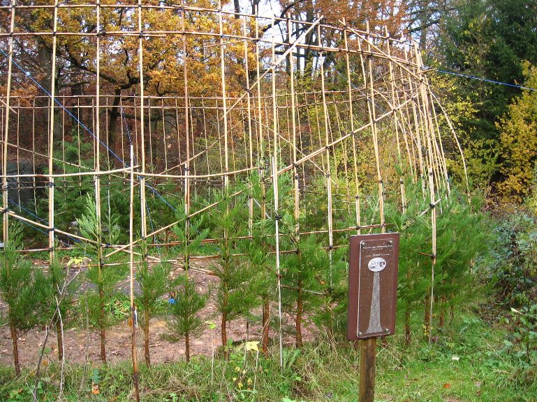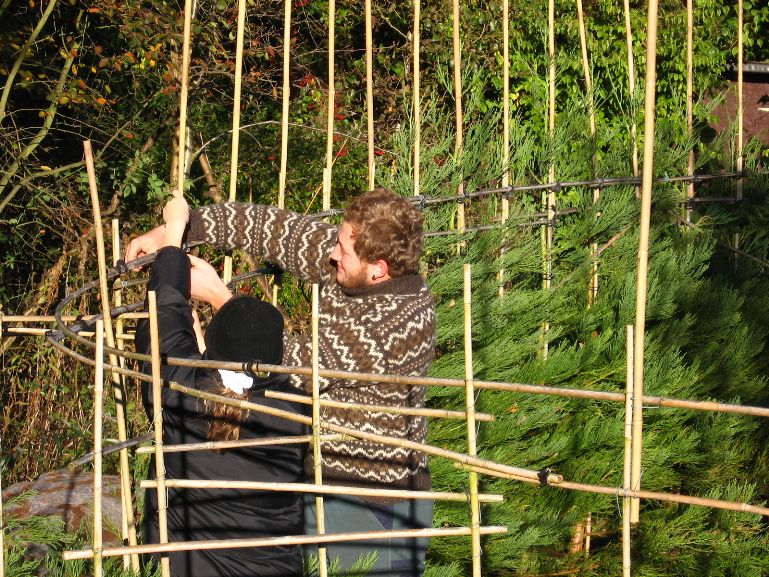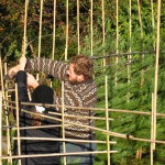 Das am 4. März 2007 gepflanzte Baumhaus aus Mammutbäumen hatte im Oktober 2007 ein erstes Gerüst aus Bambusstangen bekommen. Jetzt, 2 Jahre später, sind die ersten Mammuts schon über das alte Gerüst hinaus gewachsen (über 2m Höhe). Deshalb wurde das Gerüst jetzt nach oben erweitert. Diesmal reichten noch Leitern um das Gerüst zu bauen. Brauchen wir in zwei weiteren Jahren ein Gerüst um das Gerüst zu bauen? Wir werden sehen. Jetzt ist erst mal Zeit Bilder vom aktuellen Stand des Projektes zu genießen:
