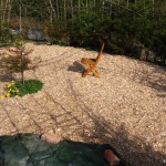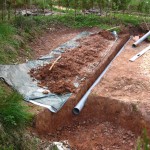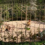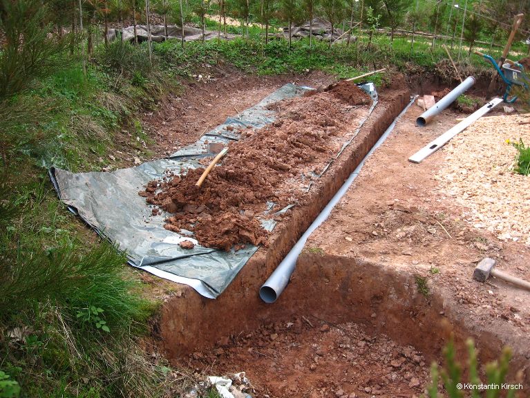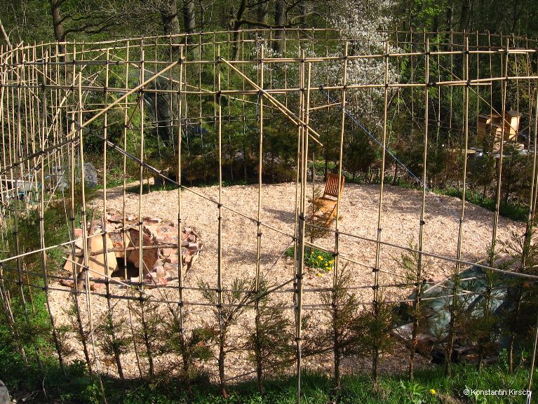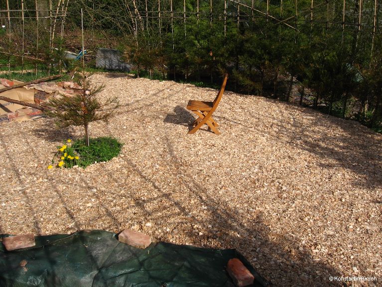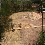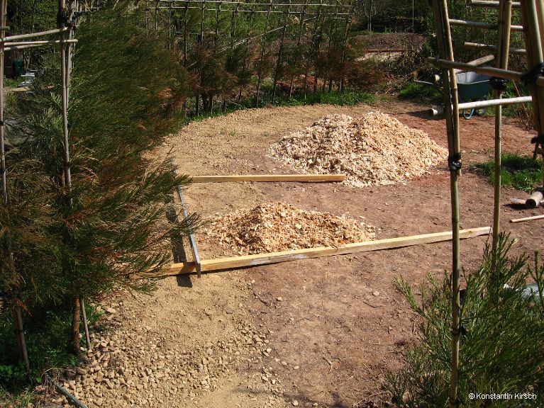 Gestern begannen die Aktivitäten um dem Mammutbaumhaus einen schönen Fußboden aus Hackschnitzel zu geben. Heute gibt die Tätigkeit weiter und es sieht richtig gut aus. Die zwei Minni-Lehm-Kühl-„Keller“ werden später noch einen stabilen Rand aus Backsteinen bekommen. Aktuell wurden diese zwei Löcher mit einem Leerrohr verbunden. So kann man später leicht Kabel und Leitungen von einem Bereich des Hauses zum anderen legen.