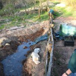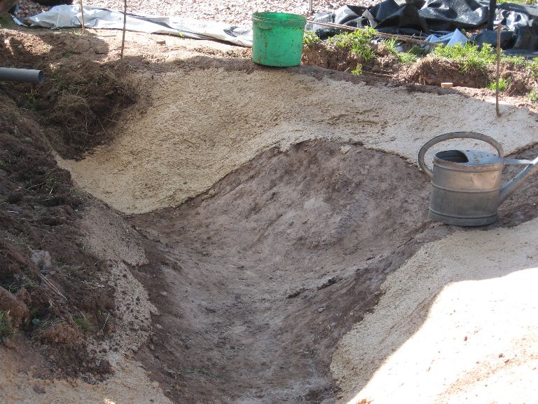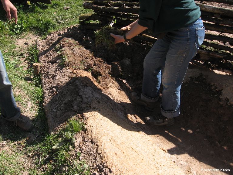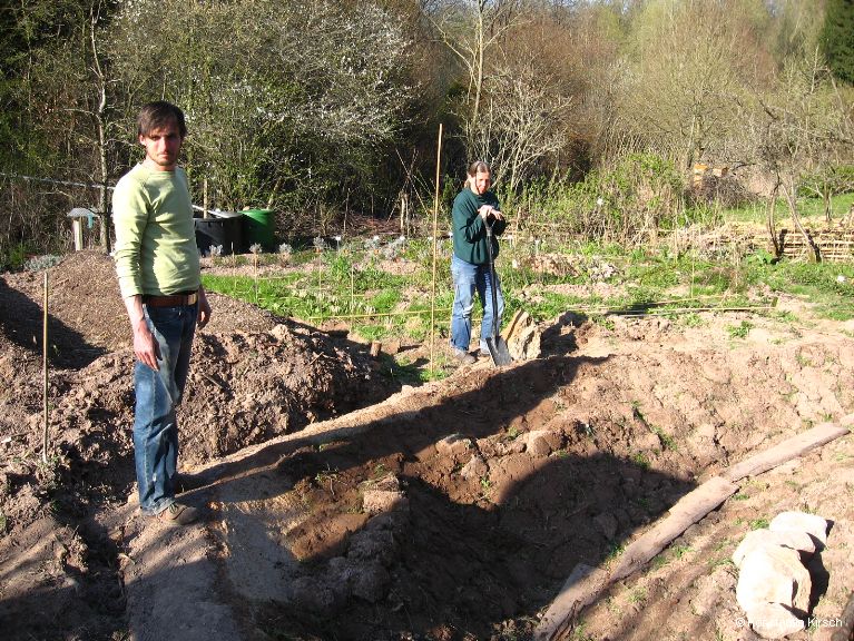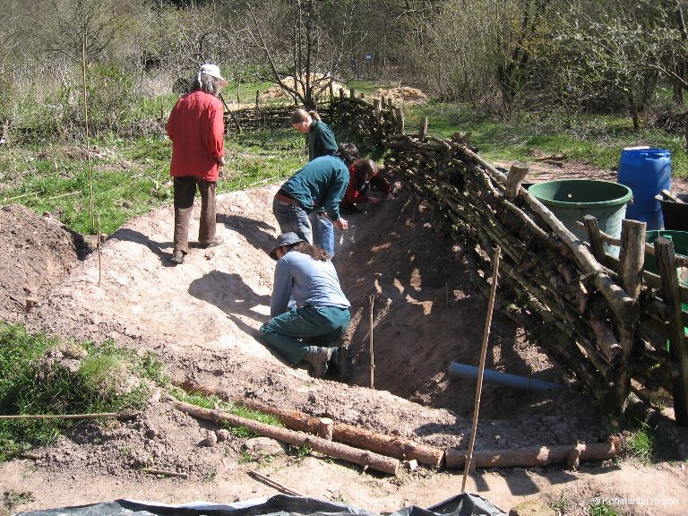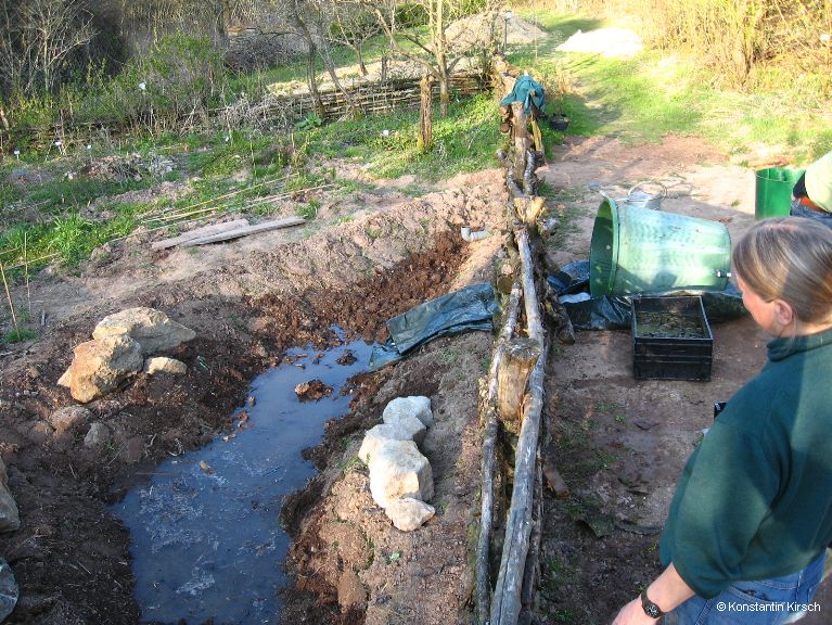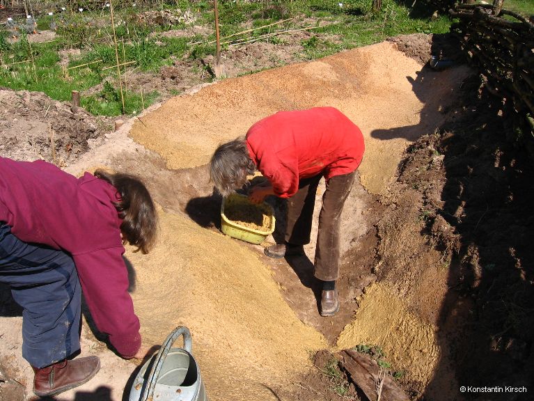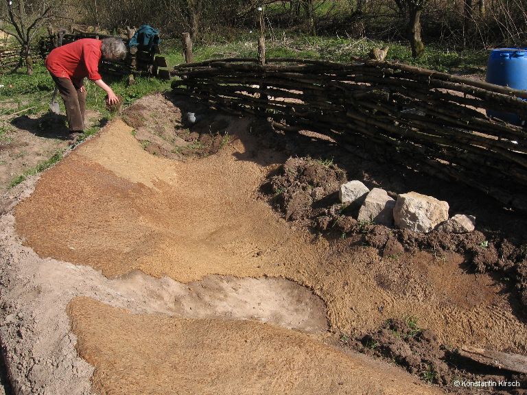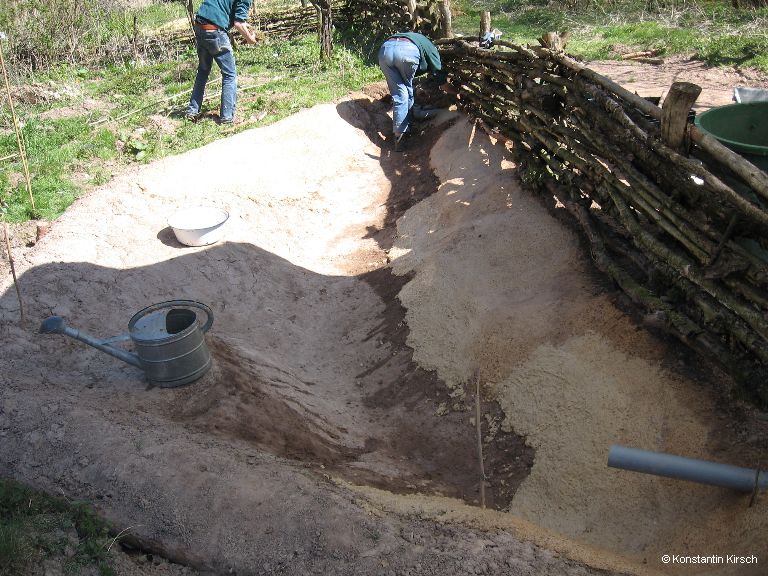 Am besten ist (laut Sepp Holzer) Lehmboden der mit Wasserzugabe und einer Baggerschaufel verdichtet wird. Dies haben wir noch nicht getestet. Wir probieren weiter. Die Leindotterversion hat nur kurze Zeit gehalten.