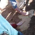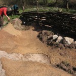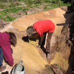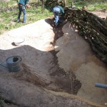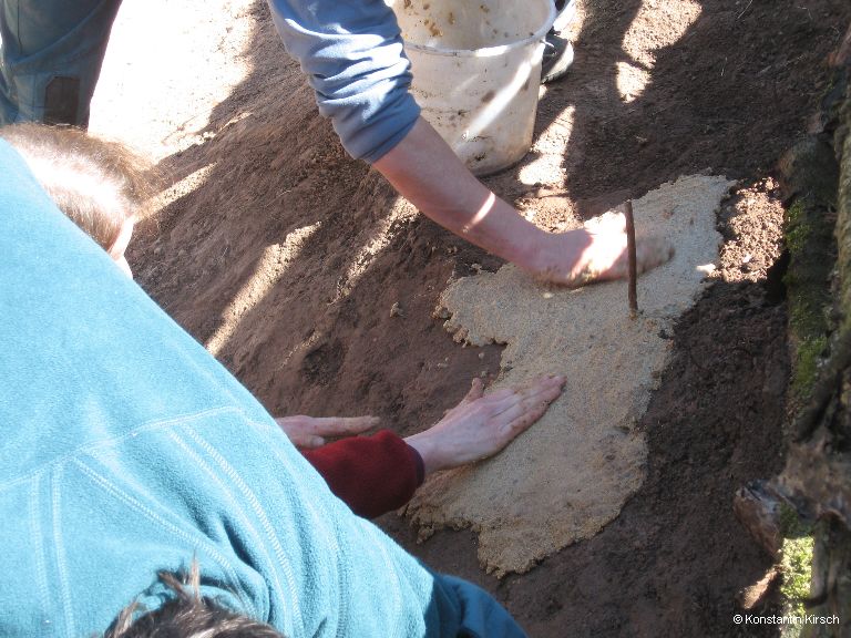 Meist wird bei Gartenteichen an eine Dichtung mit Plastikfolie gedacht. Aber muß es immer Plastik sein? Nein, es gibt viele andere Möglichkeiten. Im Rahmen des in unserem Naturbauten-Park stattfindenden Permakultur Seminars haben wir einen neuen Weg getestet. Die aus normaler Erde (leicht lehmig) gestaltete Teichform wurde zuerst genau abgesucht nach Steinen und Wurzeln und dann mit einer pflanzlichen Paste ausgekleidet. Diese Paste haben wir hergestellt aus Leindotter-Presskuchen und etwas Wasser. Wir probierten verschiedene Mischverhältnisse. Zu Beginn machten wir die Paste etwas dicker und trockener, dann bekamen wir Sorgen ob genügend Presskuchen vorrätig ist um den ganzen Teich zu dichten. Daraufhin machten wir etwas dünnflüssigere Paste und trugen diese auch etwas dünner auf (Dies war ein Fehler wie wir später feststellten – aber aus Fehlern kann man lernen). Als schutzschicht wurde die Paste mit umgedrehten Grassoden abgedeckt. Am Rand ein paar Steine – und Wasser marsch…