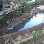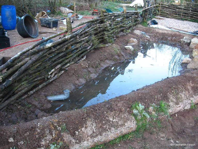 Nachtrag 2: Der Teich hat nur eine Zeit lang das Wasser gehalten. Mittlerweile haben wir einen Test gemacht mit Grasschnitt als Dichmaterial. Doch auch dies war bis jetzt nicht zu 100% zufriedenstellend. Wir experimentieren weiter.
