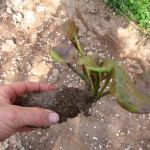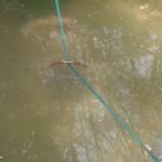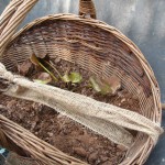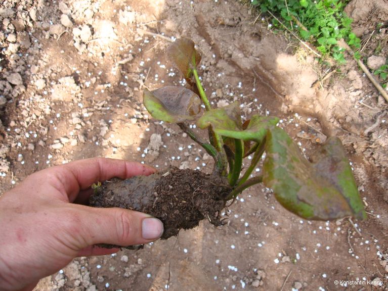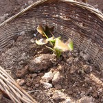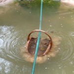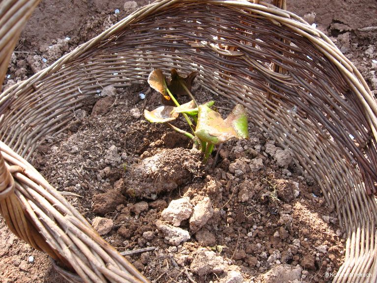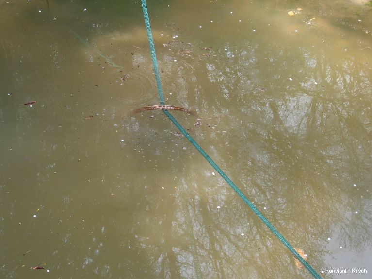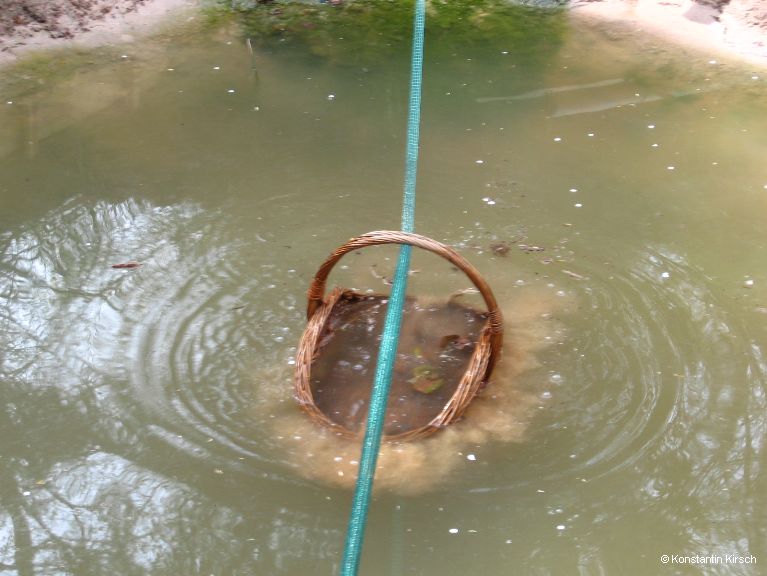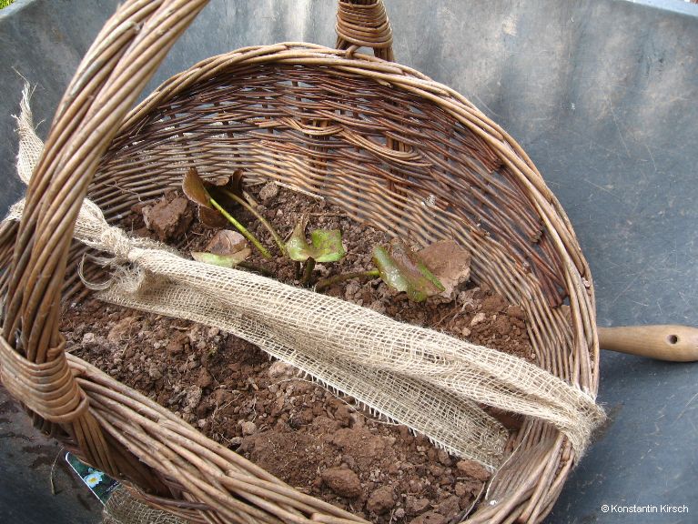 Heute habe ich eine Seerose in den großen Teich gesetzt. Da der endgültige Wasserstand noch nicht erreicht ist habe ich einen Trick angewendet: Die Pflanze wurde in einem Weidenkorb mit Erde gepflanzt und dort mit Jutegewebe fest geknotet. Dieser Pflanzkorb wurde dann an einem Seil so ins Wasser gelassen, daß er gerade so unter der Oberfläche hängt. Sobald der Wasserspiegel die geplante Höhe stabil erreicht hat wird an diesem Seil der Korb angehoben und seitlich versetzt wieder abgelassen. Dann wird das Seil entfernt und die Seerosen Wurzeln wachsen in den Teichgrund und der Weidenkorb löst sich im Lauf der Zeit auf.