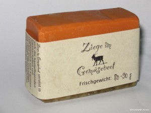 Ziege im Gemüsebeet vereint in sich die hautpflegenden Eigenschaften von Ziegenmilch und Karottensaft auf einer Grundlage aus reinen Pflanzenfetten und -ölen mit einem ausschließlich aus ätherischen Ölen komponierten Kräuterduft. Ihr Anteil an ca. 10% unverseiften Fetten macht sie ganz besonders mild und hautverträglich.
