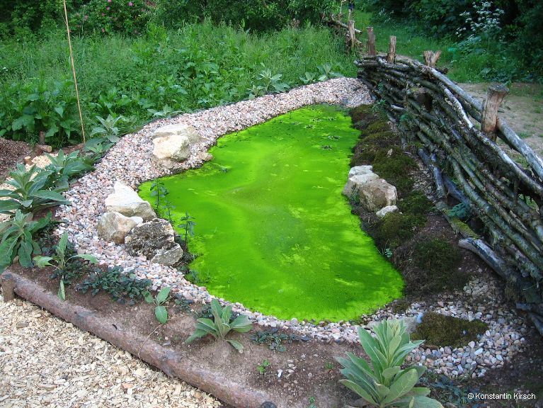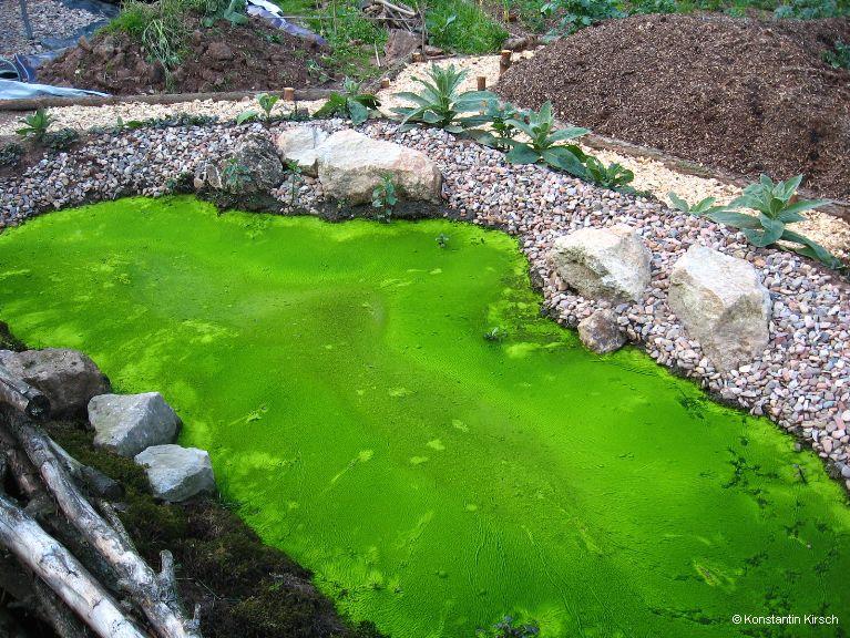 Der Ende April angelegte Teich ist weiterhin dicht. Leindotterpresskuchen als Dichtstoff hat also die Kurzzeit-Prüfung schon mal bestanden. Allerdings kam erwartungsgemäß so viel Nährstoff ins Wasser. Die Algen wachsen üppig und produzieren eine intensiv-grüne Färbung, es sieht schon fast künstlich aus. Mitten im Garten ein grell grünes Gemälde, ein Kunstwerk: