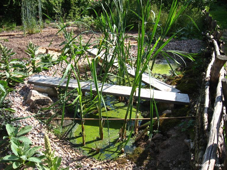 Der Ende April angelegte Teich hat heute eine Bepflanzung mit breitblättrigem Rohrkolben (Typha latifolia) erhalten. Diese Pflanze ist mehrfach nutzbar. Als leckeres Gemüse (roh und gekocht) nutzt man das Mark der Stengel und die frischen Rhizom-Sprossen. Aus den getrockneten Blättern können vielerlei Gegenstände geflochten werden.