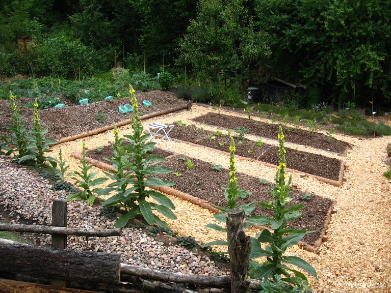 Für eine angenehme Pflege der Flächen waren die Wege mit 30 cm Breite viel zu schmal. Jetzt habe ich diesen Bereich neu gestaltet und 60 cm breite Wege, mit Holzhäcksel, geformt. Im Vordergrund sieht man die drei Testbeete mit Holzkohle/TerraPreta. Es ist eigentlich die völlig falsche Jahreszeit um Beete anzulegen. Aber jetzt geformt sind sie für das kommende Jahr gut vorbereitet. Ein klein wenig Gemüse werden sie aber auch dieses Jahr schon bringen.