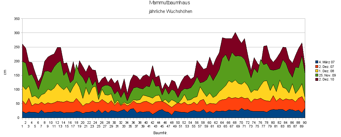 Jedes Jahr messe ich die Höhe der einzelnen Bäume des Mammutbaumhauses. Seit März 2007 sind die Bäume schon ganz schön gewachsen. Heute habe ich beim Messen wahrgenommen, daß ein Exemplar schon über 3 Meter groß ist! Das Wachstum ist deutlich ungleichmäßig. Vermutlich liegt es an Unterschieden im Boden. In den Bereichen, in denen die Bäume größer gewachsen sind, war der Boden beim Pflanzen locker. Durch Bewässerung und Schnitt gebe ich mein Bestes um die Unterschiede im Lauf der Jahre auszugleichen.