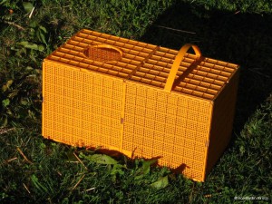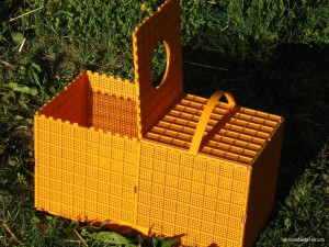 Im Imkerfachhandel gibt es die gelbe Multibox für Kunstschwärme und für Bienenschwarmversand. Für das Einfangen von größeren Schwärmen ist sie jedoch ziemlich klein. In der Tageshitze und bei Aufregung der Bienen kann es ihnen darin leicht zu warm und eng werden. Die Kiste wird aus einzelnen Teilen zusammen gesteckt und dan den Übergängen mit Drähten verbunden.
