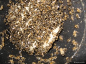 Gestern kamen die Bienen raus. Das Wabenwerk war weit größer als vermutet: ca. 2 Meter Länge! bei ca. 20 cm Durchmesser. Geschätzte 2 kg Bienen konnten lebend geborgen werden, dazu ein paar kg Honig (nach meinem Geschmack mit leichter Rauchnote…) Die Waben waren definitiv nicht vom aktuell eingezogenen Schwarm gebaut.Wir haben gar keine neuen Waben gefunden. Warum sollten sie auch bauen, war genug Hohlraum vorhanden um Nektar / Honig einzulagern.