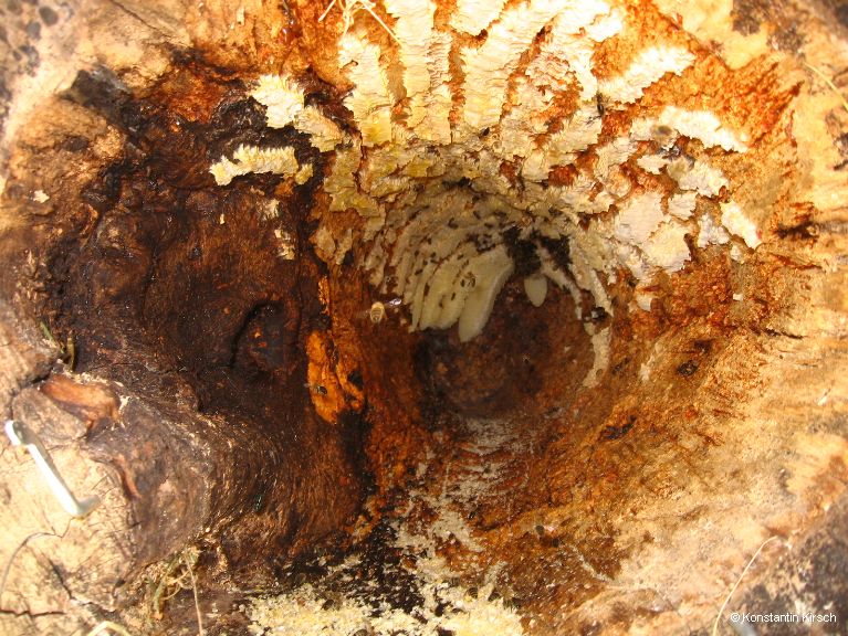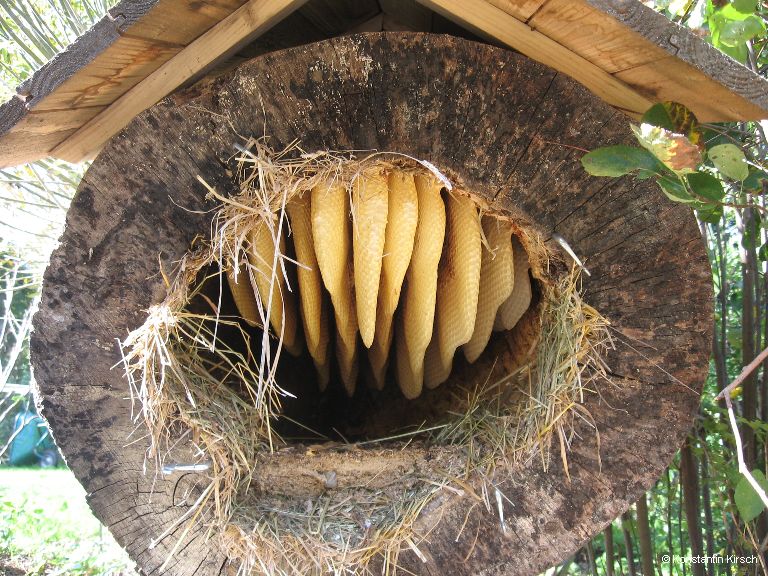 Überhaupt bin ich echt froh, dass ich Deine Seite (schon vor Jahren) gefunden habe und dort las, dass jemand es gewagt hat, sogar einen Baumstamm als Bienenbeute zu nehmen. Dein Foto von den Bienenwaben oben drin ist einfach genial! Die Bienen bauen in der Natur längs zum Einflugloch. Der russische Imker nennt es „Warmwaben-Bau“. Werden in den künstlichen Beuten aber die Waben vom Imker quer vorgeschrieben, bleibt es den Bienen nichts Anderes übrig, als quer zu bauen. Diese Bauart nennt er „Kaltwabenbau“.