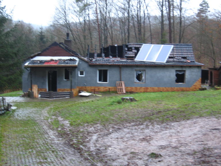 Gestern, am letzten Tag des Jahres, entstand plötzlich ein Feuer in dem ehemals gemütlichen Holzhaus. Schnell rückte die Feuerwehr aus in die Waldstraße 1 des Örtchens Bauhaus. Doch schon stand das kleine Haus in hellen Flammen. Eine riesige Wolke giftiger süßlicher Gase (Styrol) stieg gen Himmel weil der Sondermüll (Styroper) schwelte.