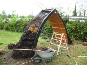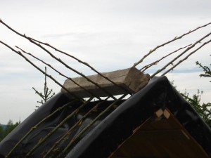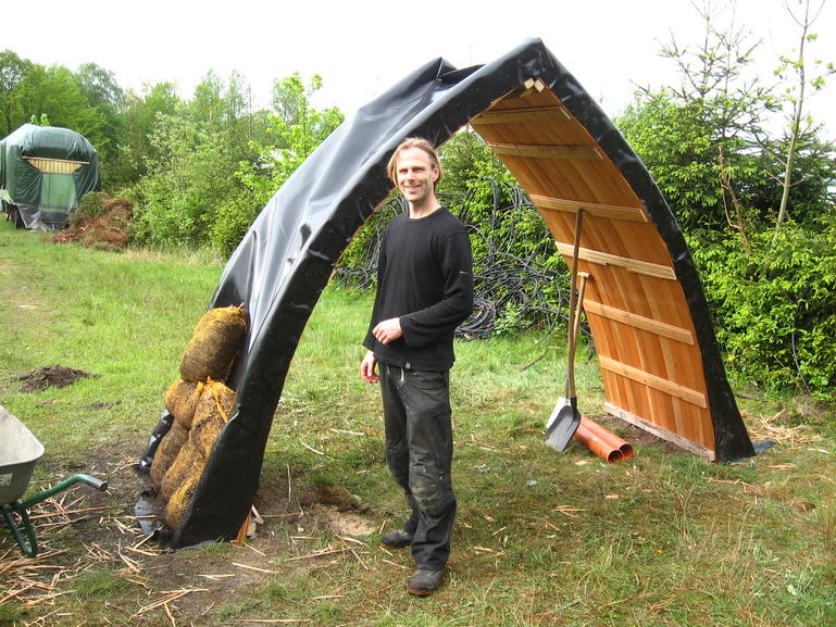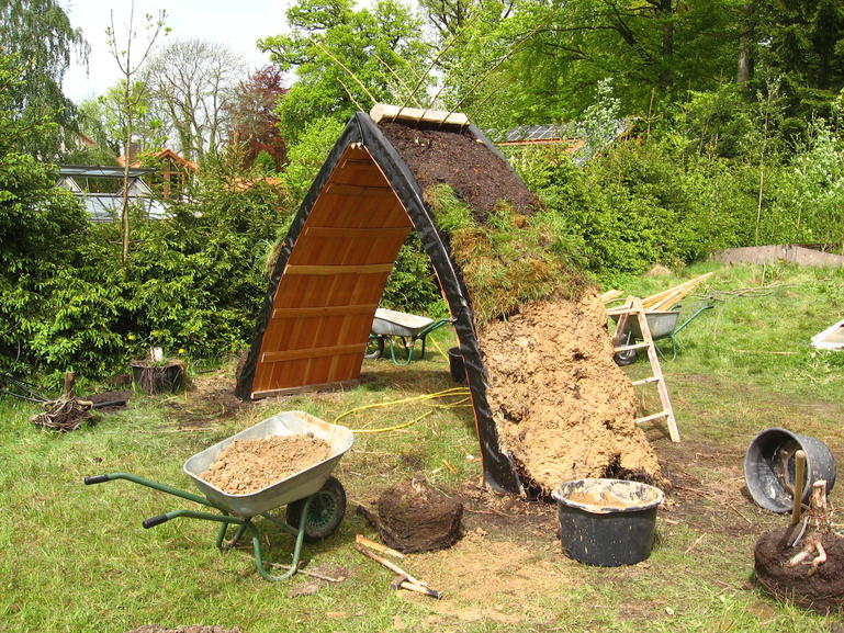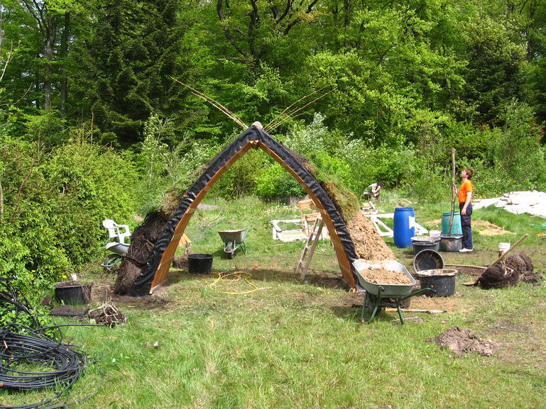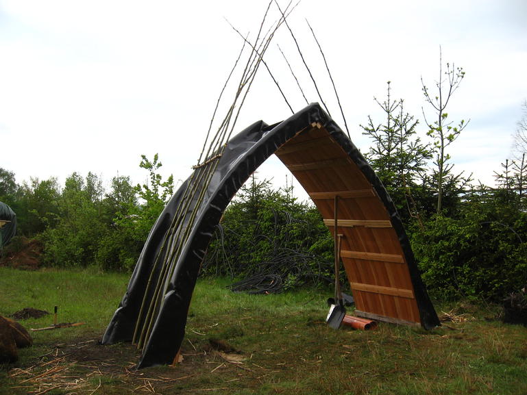 Es wird eine lebende Pappelwurzelkuppel. Auf der Schalung liegt eine Folie. Darauf kommen die Pappeln, dann Erde.