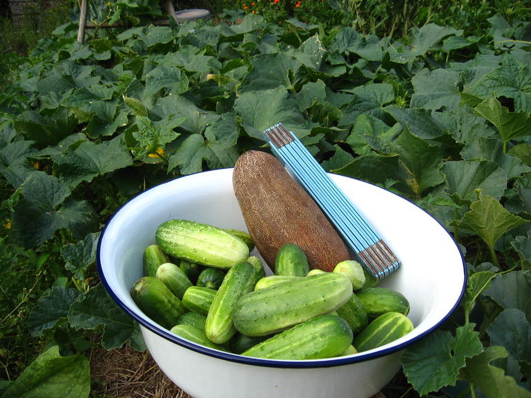 Gestern habe ich, wie nun jeden Tag, Gurken geerntet. Diesmal habe ich sie auf eine Waage gelegt. Von nur 4 Pflanzen gab es immerhin 3kg Früchte! Darunter eine 800gr Gurke, die allerdings einige Tage länger an der Pflanze belassen wurde damit die enthaltenen Samen ausreifen. Je nach Wärme und Sonneneinstrahlung ernten wir aktuell pro Tag 1 bis 2 kg Gurken. So gut sind hier noch nie Gurken gewachsen. Ich freue mich sehr diese Sorten entdeckt zu haben. Es sind braune und „Sikkim“ Netzgurken aus Indien/Himalaya. Bezogen habe ich die Samen von der Raritätengärtnerei Manfred Hans.