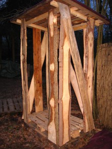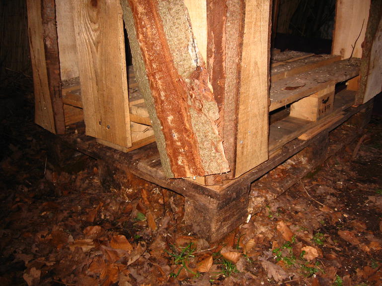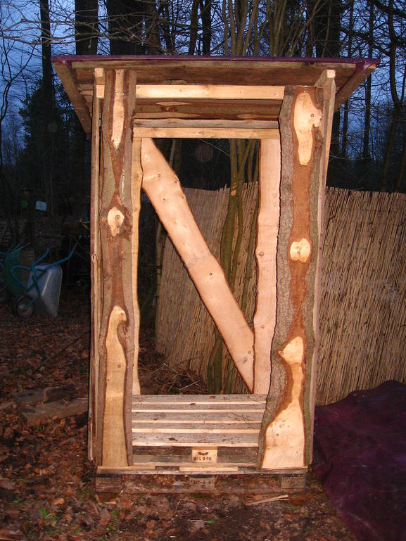 Man nehme zwei Paletten und unbesäumte Bretter vom Sägewerk. Dazu ein paar Nägel, Latten und Bretter für das Dach und fertig ist der mobile Holzschuppen für 2 Raummeter Holz!