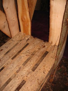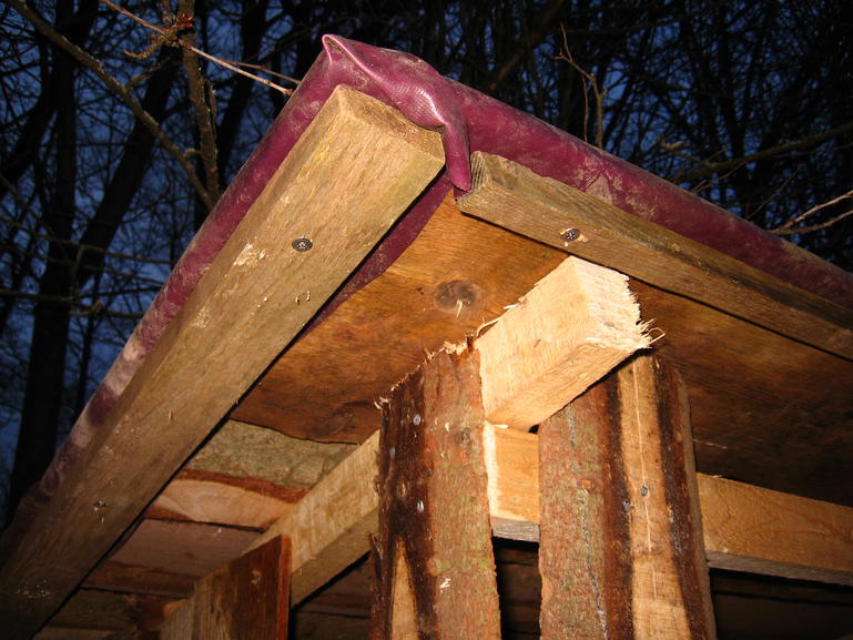 Die erste Palette wird mit einer Wasserwaage auf dem Boden ausgerichtet. Die zweite Palette wird daraufgelegt und bildet den Boden des Holzschuppens. An den Ecken der oberen Palette werden die Bretter senkrecht angenagelt. Auf den Seitenwänden und auf der Rückwand wird zusätzlich noch ein diagonales Brett befestigt.Dann wird das Dach gebaut und beispielsweise mit LKW Plane gedichtet: