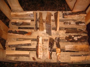 In diesem Muster wird das Brennholz in den Schuppen gelegt: Zuerst auf den Seiten kommen Holzstücke so hin, dass sie durch die Eckbretter gehalten werden. Dann kommt in der Mitte hinten eine Lage Holz so, dass die Hölzer links und recht anlehnen und als letztes füllt man die Mitte vorne auf: