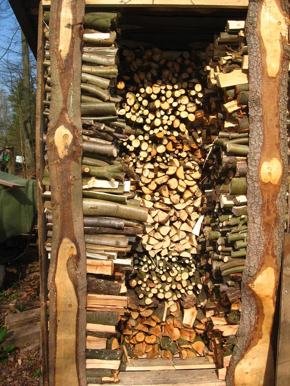 Hier sind die Seiten und die Mitte hinten gefüllt. Vorne Mitte fehlt noch. In diesem Zustand kann man einen Schritt auf die Palette machen und im Holzschuppen stehend sehr gut bis nach oben greifen und Holz stapeln / bzw. entnehmen: