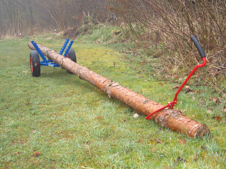 So kann man Baumstämme, beispielsweise für eine Rundholz-Hauskonstruktion gut zum Bauplatz bewegen. Selbstverständlich kann man auch lange Kanthölzer so bewegen.