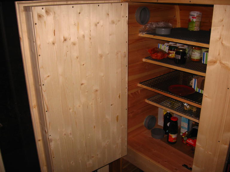 der Kühlschrank funktioniert dann sehr gut, wenn es nachts die Lufttemperatur draussen kalt wird. Wenn jedoch, wie diesen Sommer, die Lufttemperatur in der Nacht lange Zeit sehr hoch bleibt, kühlt dieser Kühlschrank nur wenig (zb 15°C), denn er kann nicht kälzter werden als draussen. Es gibt eine Idee aus Überschuss-Solarstrom eine technische Zusatzkühlung einzubauen, das habe ich aber noch nicht gebaut.